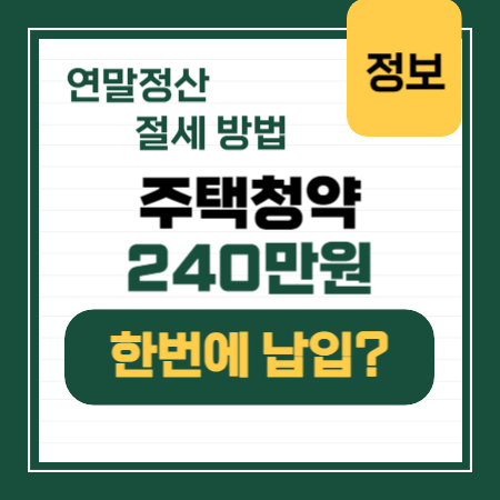 - 1월부터 11월까지 단 한 번도 청약저축을 하지 않다가, 12월에 한 번에 240만 원을 한번에 입금하였다면 소득공제를 받을 수 있을까요? 결론은 240만 원을 일시 납입 해도 된다는 것입니다. 그 외에도 12월 31일 이전에 240만 원에서 부족한 금액을 이 시 납입하더라도 모두 절세받을 수 있다는 점입니다.